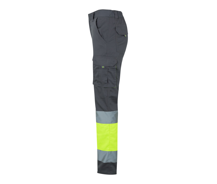 Fermeture centrale zippée avec bouton. Coutures contrastées. Taille éalstiquée. Double couture de sécurité. 6 poches : 2 poches latérales. 2 poches avec fermeture à double rabat, Velcro® et curseurs. 2 poches arrière de renconfot, à rabat et Velcro®. Certifié EN20471 : 2013 classe 1.