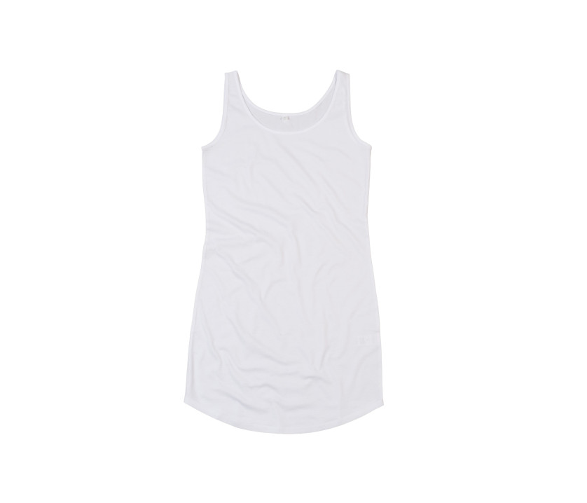Coupe slim. Longueur : au-dessus des genoux. Bas de robe arrondi. Bretelles larges. Col évasé. Biais fins au cou et aux emmanchures. Étiquette détachable.