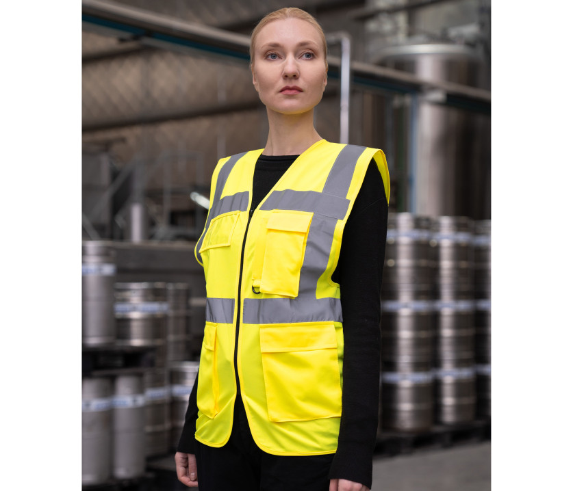 Certifié EN ISO 20471:2013/A1:2016 ; Orange certifié RIS-3279-TOM Iss 2 ; Neon Green & Neon Pink certifé EN 17353:2020 Type AB3; les autres couleurs EN 17353:2020 Type B3. Bande horizontale réfléchissante de 5cm. 2 bandes réfléchissantes de 5cm de large sur les épaules. Fermeture zippée. 2 poches avec rabats et fermeture Velcro. Multifonctionnel : poche pour carte d'identité (9,5cm x 6,5cm), grande poche pour téléphone, porte-stylos. Propriétés réfléchissantes garanties selon la norme EN pour 25 lavages à 40°C.